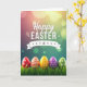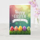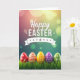 This design shows a spring scene with five glossy oval eggs lined up in a row, nestled into thick green grass along the bottom edge 🐰. Each egg has its own pattern and color—one red with white dots, one red with white stripes, one yellow with tiny white dots, one purple with white dots, and one green with white dots—giving the group a friendly, together-at-the-meadow look 🐇. Above them, the words “Happy Easter” sit centered, with “Happy” in a flowing cursive style and “EASTER” in tall, simple uppercase letters. The text is white and stands out against the softly glowing sky behind it. A narrow white banner underlines the greeting, and a row of small dark stars runs across the banner like a gentle trim. The background fades from warm golden yellow and soft pink near the top into cooler blue and green tones lower down, like early morning light settling over a field. Scattered, out-of-focus circular light spots float across the background, adding a dreamy glow around the eggs and grass 🌷.