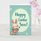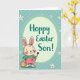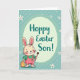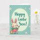 This design shows a light-furred bunny with long ears and rosy cheeks in the lower left, facing forward with a gentle, friendly look 🐰. It wears pink overalls with a small green heart on the front and a green shirt underneath, adding a sweet, caring touch to the outfit. One paw holds a paintbrush as if it has just been decorating the egg beside it, like a small shared project meant for someone special. Near its feet sits a golden-orange Easter egg covered in wavy stripes, giving the scene a cozy, festive focus. In the upper area, a pale green oval frames the message “Hoppy Easter Son!” in teal lettering, centered and easy to spot. The background is filled with soft diagonal mint-green stripes, with tiny white dots and scattered five-petal white flowers with red centers 🌷. The pale green oval sits near the top, while the bunny and striped egg anchor the lower left.