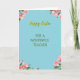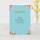 This card features a light sky-blue background that sets a gentle spring scene, with “Happy Easter” placed near the top in sunny yellow flowing lettering with a soft shadow for depth 🌷. Centered beneath it, the line “FOR A WONDERFUL TEACHER” appears in olive green, using simple, neat capital letters that feel steady and caring, like a friendly note meant to be kept. The spacing between the two lines leaves airy room, giving the message a calm, open look that reads like a warm exchange between people who appreciate each other. In each corner, small floral clusters frame the text, showing soft pink five-petal blossoms with bright yellow centers and leafy green sprigs that look lightly painted. Tiny yellow dots are sprinkled around the flowers like little bursts of confetti, adding a cheerful lift without crowding the layout 🐰. The mix of cool blue with warm pink and yellow creates a cozy contrast, like a tender smile shared during a spring celebration. Four matching bouquets sit in the corners, with rose-pink petals, yellow stamens, and green leaves surrounding the centered lettering.