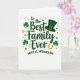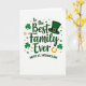 This card features a bright white background with a family-forward St. Patrick’s Day layout that feels close and affectionate, like everyone is gathered in the same room. Centered text reads “To the Best Family Ever” in rich green lettering, with “Happy St. Patrick’s Day” placed nearby as a smaller line in matching green. Around the words, shamrocks in several shades of green float in different sizes, creating a gentle, friendly rhythm that guides your eyes across the page 💚. In the upper right corner, a deep emerald leprechaun hat sits at a jaunty angle, and its gold buckle adds a warm metallic pop. Near the bottom, a glowing golden horseshoe adds another bright accent, echoing the buckle and tying the warm gold tones together ☘️. Small green dots and tiny orange cross marks are sprinkled through the open white space, adding texture without crowding the design. The overall look includes the angled hat at the top right, the centered green text, and the golden horseshoe near the bottom framed by scattered shamrocks and orange accents.
