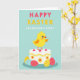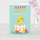 This card shows a plump yellow baby bird with wide, gentle eyes and a soft rosy cheek, standing proudly on a smooth white cake with its small wings slightly open as if offering a friendly hug 🐰. The cake is trimmed with thin yellow stripes, dotted with tiny crimson candy circles, and decorated with simple flower shapes in goldenrod and coral that feel sweet and affectionate. Below the cake, a cozy cluster of decorated eggs in sunny yellow, pale blue, and coral nestles together, their dots and squiggles arranged like little notes passed between close friends 🐇. The background is a calm soft teal, making the warm yellows and corals stand out without feeling harsh. At the top, “HAPPY EASTER” appears in large coral and goldenrod letters, centered and easy to read. Just beneath it, “GRANDSON’S FIRST” is set in crisp white lettering, also centered, creating a tender, keepsake-style focus. Small floral motifs sit along the cake’s sides, and the eggs gather tightly at the base against the teal backdrop.