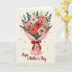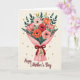 This card features a lush bouquet of flowers centered on a light cream background, with soft pink, warm coral, and deep red blooms tucked into rich green leaves and a few small yellow buds. The petals have a gentle painted look, and the arrangement feels like it was gathered for someone special, as if offered with a quiet smile ❤️. The stems are wrapped in a pale rose paper wrap with crisp folds, giving the bouquet a cared-for, gift-like look. A deep red ribbon is tied neatly at the base, and a small tag with rough edges hangs from it like a little note meant for a close friend. Near the bottom, a short line of text sits centered in a dark, elegant flowing style that stands out clearly against the pale background. Tiny golden specks are scattered around the bouquet like soft confetti, adding a celebratory shimmer 🌼. The gold flecks vary in size and spacing, floating across the cream space around the flowers.