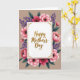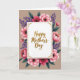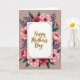 This card features a white rectangular panel at the center, edged with a thin gold outline and tiny gold flourishes in the corners, giving it a polished, special-occasion look. A short message sits in the middle of that panel in flowing gold lettering, like a gentle note meant for someone close ❤️. Surrounding the panel is a full floral wreath, where large pink blossoms (ranging from soft blush to deep fuchsia with touches of red) lean inward as if gathered in a tender embrace. Each flower has a dark center dotted with small golden-yellow details, adding texture that feels like careful attention to someone you care about. Slender purple sprigs weave between the blooms, while broad deep-green leaves fill the gaps, creating a cozy, companionable frame 🌼. The background is a muted taupe, which makes the pinks, purples, and gold stand out without feeling harsh. The gold message remains centered inside the white panel, encircled by layered petals and leaves that form a rounded wreath against the calm taupe backdrop.