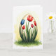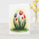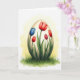 This design shows an ornate oval shape like a spring egg rising from a thick patch of green grass, with a gentle, affectionate mood suggested by the way the flowers lean toward one another as if in quiet companionship. Crimson tulip-like blooms curl around the oval, their petals opening in smooth arcs that feel tender and inviting 🌷. Near the upper left, a larger cerulean flower spreads wide, adding a cool accent against the warmer reds. Tucked among the petals is a small, textured crimson bud with dotted details that reads like a berry or unusual bloom. A soft backlight creates a golden-yellow halo behind the oval, fading into a bright white background for an airy look. There is no text on the front, leaving the artwork centered and unobstructed so the shapes and colors do the talking 🐰. At the base, earthy greens shift into lighter spring blades, with fine strokes that make the grass look gently wind-swept.