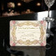 Transport your guests to a fairytale with this Rococo-inspired design featuring antique flourishes and soft blooms. Perfect for formal garden weddings.This design features a lavish, symmetrical Baroque frame rendered in an antique yellow-gold tone, adorned with intricate scrollwork and filigree. Nestled within the borders are hand-illustrated roses in shades of soft blush and dusty pink, accented by sage green foliage. A whimsical cherub illustration anchors the top of the composition against a warm cream and ivory background. The text is presented in an elegant black calligraphy script paired with a classic serif font for legibility.This is a flat printed image with a Faux Gold Foil effect, not actual raised metal or hot foil stamping.