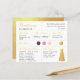 A faux gold bridesmaid info card, including information about the wedding date and location, the wedding colors, the bridal party, the bridesmaid dress and a bridesmaid proposal message. The name of the bridesmaid and the titles are written in an elegant script. In the lower right corner, there is a faux gold foil dress. In the center, there are the wedding colors in circles. The colors can be changed, with the exception of the gold circle, that is faux gold foil. The back is also faux gold foil.