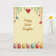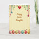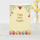Designed with a soft, creamy yellow background lightly textured with fine vertical stripes, this card sets a gentle spring setting 🌷. Centered on the front is a seasonal greeting in warm, shadowed orange lettering that stands out clearly against the pale backdrop. Above the text, an arched canopy of stylized green foliage curves like a protective embrace, hinting at closeness and care. From that greenery hang strands of multicolored beads, dotted with tiny butterflies and small glossy hearts that seem to drift downward with a light, romantic flutter. At the top center, a larger ruby-red heart sits like a focal jewel, drawing the eye and suggesting affection through its placement. Along the bottom, a row of decorated egg-shaped designs fills the space, each with its own patterns such as stripes, dots, and petite floral motifs in springtime hues 🐰. Small blossoms and scattered red petal-like shapes weave between the eggs, adding little moments of connection across the lower edge. The beads fall in neat vertical lines from the green arch, ending just above the patterned eggs.