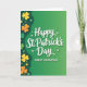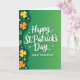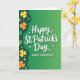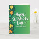 The front design shows a green background that shifts from lighter green near the upper right to deeper emerald toward the lower left, setting a fresh St. Patrick’s Day scene 💚. Along the left edge, a darker green scalloped strip looks like layered paper, giving the layout a gentle sense of depth. Scattered across that strip are shamrocks and small four-petal flowers in golden yellow, soft orange, and mixed greens, like little tokens passed between close family members ☘️. Centered in the open space, the words “Happy St. Patrick’s Day” appear in white, flowing lettering with a faint shadow that helps it stand out. Just below, “GREAT GRANDMA” is written in white, all caps, in a simple sans-serif style that reads clearly and feels like a direct, affectionate address. Near the word “Day,” tiny white dots and small arrow marks add a light frame without crowding the message. The left border’s scallops, the floating clover shapes, and the small white accents create a layered look against the green gradient.