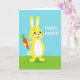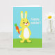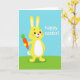 This card shows a golden-yellow bunny standing front and center, drawn with smooth, simple shapes that feel friendly and approachable 🐰. Long ears rise above its head, a soft white belly sits in the middle, and a small tail peeks out behind. Its dark, wide eyes and blush-pink cheeks pair with a tiny rosy nose and an open smile, like it’s greeting someone it really likes. One paw reaches forward to offer a bright orange carrot with leafy green tops, adding a sweet, sharing gesture that reads like friendship—or a gentle crush—without saying a word 🐇. The scene is split into two flat color fields, with a bright green ground below and a light sky-blue background above. In the upper right corner, rounded white lettering sits neatly against the blue area, leaving plenty of open space around it. The carrot angles slightly upward toward the text, and the bunny’s ears point into the blue, while the green lawn stretches evenly across the bottom.