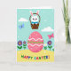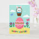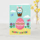 This greeting card shows a large pink egg centered on the front, decorated with white wavy stripes, scattered white dots, and a green zigzag that feels like a sweet little love note in pattern form. Above it, a fluffy white bunny with long ears peeks out of a rustic basket, its gentle eyes angled downward as if sharing a fond glance with the scene below 🐰. The basket is filled with round, candy-like treats in assorted colors, adding small pops of color around the bunny. Behind them, a light blue sky holds soft white clouds and tiny white specks that look like confetti drifting through the air. In the foreground, rolling golden-yellow hills are sprinkled with simple purple and white flowers 🌷, setting up a cozy, friendly backdrop. Two butterflies—one soft blue and one light pink—float across the sky, echoing the tender, easy mood between the bunny and the bright egg. Near the bottom, the words “HAPPY EASTER!” appear in large, multi-colored letters, standing out against the yellow ground. The pink egg sits squarely in the middle, with the basket and bunny just above it and the butterflies spaced to either side.