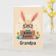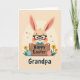 This card features a sweet long-eared bunny in soft beige and rosy tones, wearing dark spectacles and a neat blue bow tie, with a gentle, friendly look 🐰. The bunny holds a rustic wooden sign close to its chest, as if offering it to someone special with quiet affection. Centered on the sign, a festive Easter greeting appears in dark lettering, standing out clearly against the wood grain. Beneath that, a larger line of text sits lower on the sign in the same dark color, aimed at a loved one in a family. Behind the character, a pale circular halo glows against a creamy pastel background, giving the scene a soft springtime focus 🌷. Small yellow flowers with green leaves sit to either side of the sign, and two decorated eggs rest nearby—one light blue with white speckles and one pink with matching dots. Tiny multicolored hearts float around the bunny, and the wood sign shows rough edges and visible texture lines.