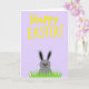Designed with a soft pastel lavender background, this card keeps the layout simple while still catching the eye. Across the upper area, a cheerful Easter message sits in thick, rounded yellow letters, spaced wide so it feels open and friendly. Below the text, a grey long-eared bunny 🐰 peeks up from the bottom edge, as if leaning in for a sweet hello. Its face is drawn with small black dot eyes and a gentle curved smile that reads like a warm, friendly glance. A band of bright green grass with jagged blades stretches across the lower section, partly hiding the bunny in a way that suggests a shy, affectionate moment. The flat color shapes and crisp outlines keep everything neat and easy to read, with the yellow words standing out strongly against the lavender field. A tiny 🌷 touch of spring energy comes through in the fresh green and the calm purple backdrop. The bunny’s ears rise above the grass line, rounded at the tips, with the green blades pointing upward in uneven rows.