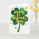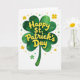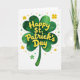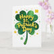 This card shows a large four-leaf clover centered on a bright white background, painted in layered emerald and deep forest greens with a soft watercolor texture that feels gentle and inviting 💚. Across the middle of the clover, the words “Happy St. Patrick’s Day” stretch from left to right in golden-yellow letters with rounded highlights and light shadows that make them look slightly raised. The warm yellow against the green reads like a friendly toast shared between close friends, easy and affectionate without trying too hard ☘️. Around the clover, small four-petal flowers and tiny star shapes scatter loosely, like confetti drifting in from the edges. These little accents appear in sunshine yellow and pale green, adding a light sparkle that keeps the scene lively. The text sits neatly across the clover’s widest leaves, staying centered and easy to read. The overall layout leaves plenty of white space so the clover remains the clear focus. Near the border, the smallest stars and flowers float in uneven clusters, with a few tucked close to the corners in soft yellow and light green.