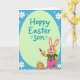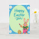 Designed with a springtime look, the card centers on a large pale green egg-shaped panel that feels like a sweet backdrop for a family greeting. Across the middle of that panel, the words “Hoppy Easter Son” appear in teal lettering, standing out clearly against the soft green. Beneath it, an upright bunny in warm orange tones gazes forward with a friendly, affectionate expression 🐰. The bunny has pink inner ears and a bright pink nose, and wears pink overalls decorated with small green heart patches over a simple green shirt, suggesting a caring, close-to-home theme. In one paw, it holds a paintbrush with a fuchsia-tinted tip, as if it’s decorating for someone special. Near its feet sits a smaller brown egg filled with zigzags and dots in multiple colors, adding a cozy, shared-craft feel 🌷. The background is sky-blue gingham sprinkled with white daisy-like flowers with yellow centers and scattered white polka dots.