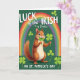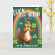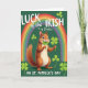 This design shows a reddish-brown squirrel with a creamy belly sitting front and center, looking out with wide eyes and a soft smile that feels like it’s meant for someone special. Its fluffy tail curls behind it, adding texture against a deep emerald green background that sets a cozy St. Patrick’s Day scene. A rainbow 🌈 arches above like a canopy, wrapping around the main message placed near the top. The phrase “LUCK of the IRISH to my Darlin’” appears in light lettering within the rainbow’s curve, standing out clearly against the darker green. Near the bottom, “ON ST. PATRICK’S DAY” is set in smaller, matching text to balance the layout. The squirrel holds a three-leaf clover in its mouth and grips a four-leaf clover in its right paw ☘️, as if offering a lucky little token to a sweetheart or close friend. Scattered shamrocks and four-leaf clovers dot the background around the character, with the rainbow’s stripes glowing above them.