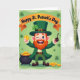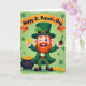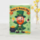 This card shows a cheerful leprechaun centered on the front, flashing a wide grin and a friendly wink that feels like he’s sharing the joke with you 💚. He wears an emerald outfit with a tall green hat topped by a shamrock, a long coat, and buckled shoes, while his bright orange beard stands out against all the greens. In one hand he holds up a shiny gold coin as if offering it to a close friend, and in the other he steadies a small brown pipe. Beside him sits a black pot brimming with gold, with a few coins scattered on the green ground like little trails leading your eye across the scene ☘️. The background is a soft green gradient with lighter shamrock shapes repeating behind him, giving the setting a festive Irish look without feeling busy. Across the top, an orange banner carries the words “Happy St. Patrick’s Day” in dark lettering, arcing neatly above his hat. The gold coins catch the light with small highlights, and the pot’s rim and shadows are drawn in deep black against the green backdrop.
