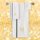 Create your own custom, personalized, cool, classy, stylish, classic,black racing stripes design, modern, minimalist, elegant faux gold calligraphy typography script font monogrammed initial on white color background, trendy, machine washable, bath towel set that includes 30" x 60" bath towel, 16" x 28" hand towel and 13" x 13" washcloth. To customize, simply type in your monogram / initials. Makes a great custom gift for birthday, fathers day, mothers day, wedding, graduation, christmas, holidays, new years, and more, for your loved ones, kids, grandkids, mom, dad, grandpa, grandma, brother, sister, son, daughter, uncle, aunt, husband, wife, bride, groom, friends and family.