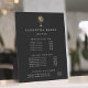 Elegant plaque with easel displays your salon services or price list in classic white lettering on a rich charcoal gray background adorned with a tropical faux gold palm tree illustration. Includes three customizable headings and body text fields. To adjust layout, enter your text and then use the Customize function to change positioning and font sizes.