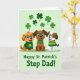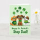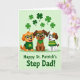Designed with three cartoon puppies lined up across the lower middle, this St. Patrick’s Day card shows them leaning close with wide smiles that feel like best friends posing for a photo 💚. The left puppy is amber-colored in a green sweater with a shamrock on the chest, the center puppy is chocolate-brown with a green bandana, and the right puppy is white with brown speckles in a green-and-yellow striped jumper. Each one wears emerald-green framed glasses, which makes their expressions look extra bright and attentive. Behind them, a pale green background sets a gentle holiday scene, with small four-leaf clovers floating down from the top ☘️. The greens range from deeper tones in the outfits to lighter shades in the drifting clovers, keeping the palette unified without feeling heavy. Centered beneath the trio, the message “Happy St. Patrick’s Step Dad!” appears in dark green lettering, placed just below their paws. Above their heads, the clovers are scattered like confetti across the upper half of the card against the soft green backdrop.