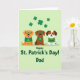 This greeting card features three cartoon dogs sitting side by side on a pale lime-green background sprinkled with small dark-green shamrocks ☘️. The left dog is orange-brown and wears an emerald sweater with a four-leaf clover, smiling as it leans slightly toward the others like it’s in on a shared joke. In the middle, a chocolate-brown pup in a green bandana with a shamrock looks outward with an easy, friendly grin, its glasses giving it a thoughtful, sweet look. On the right, a white-and-brown speckled dog wears a green-and-white striped sweater and turns in close, as if posing for a group photo with close friends 💚. Each dog has eyeglasses, with frames in green or warm orange that echo the fur tones and tie the group together. Along the lower portion of the card, deep green text reads “Happy St. Patrick’s Day! Dad,” set clearly beneath the trio. Above their heads, scattered shamrocks float across the upper area against the soft green backdrop.