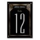 A beautiful coordinating Wedding Reception table number card. This template features a black background with faux gold shaded graphics. A double, rectangular frame encompasses the ornate 1920s geometric Art Deco movement Great Gatsby style pattern.