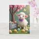 Designed with a soft spring look, the card centers on a fluffy young lamb with cream curls, rosy cheeks, and a neat purple bow tie, standing slightly off-center and looking forward with wide brown eyes that feel gently affectionate. Behind it, a pale green background sets a calm outdoor scene, with a flowering tree branch sweeping in from the upper left in small pink blossoms 🌷. A few tiny yellow butterflies float through the open space, adding light movement around the lamb. Along the bottom, thick emerald grass is drawn with fine detail, and scattered eggs in blue, orange, pink, and white sit nestled between the blades. Some eggs have polka dots, and their bright patterns create a sweet, shared moment of discovery, like two friends spotting hidden treats together 🐰. On the left side, a rustic wooden crate holds more eggs, and a short seasonal greeting appears on the crate in small, simple lettering. A warm golden glow falls from the top right, catching the lamb’s wool and the glossy egg surfaces while the pink blossoms frame the upper corner.