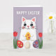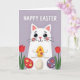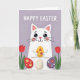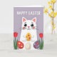 This greeting card shows a large white cartoon cat with wide, gentle eyes and soft pink cheeks, standing front and center on a pastel lavender background. The cat’s rounded paws hold a golden oval with a floral pattern close to its chest, like it’s guarding a small gift meant for a close friend. Two tall red tulips with green stems rise on either side, adding a romantic spring touch 🌷. Near the bottom, three decorated ovals sit in a neat row, including a deep red one with yellow flowers, a creamy one with light floral accents, and a dark purple one dotted with petal-like spots 🐰. Above the cat, a short Easter greeting appears in simple white lettering, placed near the top edge so it’s easy to read. The overall layout feels balanced and sweet, with the tulips framing the figure and the ovals anchoring the lower area. Small floral details repeat across the golden oval and the three bottom ovals, tying the reds, yellows, creams, and purples together.