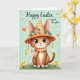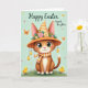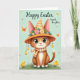 Designed with a sweet spring scene, this card features an upright, human-like cat sitting on bright green grass, looking straight out with large green eyes and a soft blush that feels like a friendly, affectionate glance 🌷. The cat wears a wide orange hat with cream stripes, decorated with small pastel flowers and leafy accents, and a matching striped scarf wrapped neatly at the neck. From the hat brim, a few striped egg-shaped ornaments hang down like little charms, adding a festive Easter touch 🐰. Near the cat’s paws, two tiny yellow bird-like companions stand close together, echoing the cozy togetherness in the main character’s gentle smile. Behind them is a calm blue-green background with small butterflies and scattered floral motifs drifting across the space. A short Easter greeting appears near the top in a light-colored lettering style that stands out softly against the background. The lighting stays soft and airy, and the hat’s flower cluster shows pink and yellow blooms with green leaves tucked along the brim.