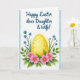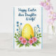 This card features a glowing yellow egg shape centered on a white background, edged on the left and right by soft blue watercolor borders. The egg has tiny orange speckles that give it a sunlit, textured look, like something carefully painted for spring. It sits in a low nest of layered green leaves and slim stems, arranged close together as if gathered with care for someone special. Around the base, bright pink flowers with yellow centers lean inward, creating a gentle, affectionate circle 🌷. Slender sprays of small blue blossoms rise on both sides, framing the centerpiece like two companions standing close 🐇. Near the top, a short greeting appears in flowing deep-blue lettering, centered above the flowers. The blue border looks like a light wash fading softly into the white space.