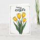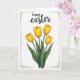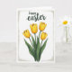 Designed with a springtime look, this card features four closed yellow blossoms rising together like close friends leaning in 🌷. Each flower has gentle orange-yellow shading that gives the petals a soft, waxy glow and a tender, affectionate feel. Long green leaves and slim stems fan out beneath them, detailed with fine lines that add texture without feeling busy. The background stays bright white, giving the bouquet plenty of breathing room and making the colors stand out. Near the top, a short Easter greeting sits centered in dark green, written in flowing calligraphic lettering. A soft gray border with a lightly worn texture frames the scene, adding a cozy, rustic touch. The yellow blooms sit just below the message, clustered tightly above the layered leaves like a small bouquet offered with care 🐇.