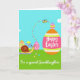 Designed with a lively spring scene, the card shows a large striped egg on the right in fuchsia, orange, and lime green, with a friendly greeting written across its center in a loose, hand-drawn style. To the left, a small garden snail with a warm brown spiral shell glides over a green lawn, its gentle curve suggesting an unhurried, companionable stroll. Three smaller decorated eggs sit nearby, each covered in dots and swirls in mixed pastel and bright colors, like little gifts set out for someone special 🐰. The background is a light blue sky with soft white clouds, keeping the setting open and airy. Near the top, a yellow-and-orange winged insect arcs across the scene, leaving a dotted trail of tiny multicolored circles that feels like a flirtatious flourish 🌷. A short dedication appears along the bottom edge in a contrasting color, centered and easy to spot without taking over the artwork. The lawn is a rich green with a faint path behind the snail, and the dotted trail curves upward toward the upper right.