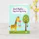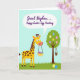This design shows a bright spring scene with a long-necked yellow creature patterned in brown, gazing forward with wide, gentle eyes and a soft pink snout as it balances a matching yellow basket. Inside the basket sit several pastel egg shapes, and the creature’s careful posture reads like it’s gathering treats for someone it cares about. A pale blue sky stretches above a field of green grass, setting a calm backdrop for the search. On the right, a tree with a brown trunk and rounded green canopy is decorated with hanging eggs in blues, yellows, purples, and pinks, like little gifts waiting to be found 🌷. A small brown basket hangs from one branch, and two eggs rest on the grass below, placed close together like a shared discovery. Near the creature, a large white speech bubble holds a short Easter message in dark purple lettering, positioned centrally within the bubble for easy reading 🐰. The scene includes the yellow basket near the creature’s neck and the egg-covered tree to the right against the light blue sky.