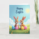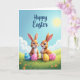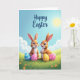 Designed with two long-eared animal friends sitting close together on a rich green hill, this spring scene feels sweet and companionable 🐰. Their golden-brown fur and bright blue eyes stand out, and their gentle smiles tilt toward each other as if sharing a quiet joke. Around them, decorated egg-shaped treats in sky blue, hot pink, and sunny yellow rest in the grass, covered with stripes, swirls, polka dots, and simple geometric patterns. The background opens into a clear blue sky with a warm golden sun in the upper right, casting a soft glow across the hillside. A few rounded white clouds float nearby, adding a calm, airy touch 🌷. Near the top, a festive greeting appears in deep indigo lettering, centered and easy to spot against the sky. In the foreground, tiny yellow flowers blur softly along the bottom edge, peeking through the grass.