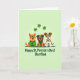 Designed with three cartoon-style dogs dressed for St. Patrick’s Day, this illustration sits on a soft pale green gradient background that keeps the scene light and friendly 💚. On the left, an orange dog with perked ears wears a green sweater with shamrocks and green-rimmed glasses, smiling as if leaning into the group like a close friend. In the middle, a darker terrier-type dog sports an emerald bandana and matching glasses, his little tongue showing in a relaxed, affectionate grin. On the right, a brown-and-white dog in a green-and-white striped shirt beams back at the others, giving the trio a cozy, together-at-the-party feel ☘️. Above their heads, three shamrocks float in a gentle arc, echoing the green accents in their outfits. Along the lower portion of the card, dark green lettering reads “Happy St. Patrick’s Day! Best Dad,” centered beneath the dogs and easy to spot. The green glasses repeat across all three characters, and the shamrocks hover near the top against the pale green backdrop.