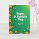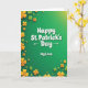 This card features the message “Happy St. Patrick’s Day My Love” in large white rounded lettering centered on a smooth emerald-green background 💚. The green shifts darker near the top and warms into a brighter yellow-green glow toward the lower right, giving the scene gentle depth. Around the edges, clusters of clovers and small star-shaped flowers frame the words, with most of the decoration gathered along the left side and the bottom-right area ☘️. Some clovers are shaded in classic greens while others shine in golden-orange, like little sparks of luck tucked into the border. The shapes have soft shadowing that makes them look slightly raised, as if you could trace them with your fingertips. “Happy St. Patrick’s Day” sits above “My Love,” and tiny white arrows on either side of the word “Day” add a neat accent. Along the left edge, layered clovers in green and gold overlap with a few small white floral stars against the deepening green.