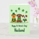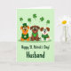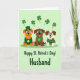 This card shows three cartoon dogs sitting close together on a curved, darker-green grassy hill, their shoulders nearly touching like good friends posing for a photo 💚. On the left is an orange dog wearing a green leprechaun hat with a gold buckle and a green sweater marked with a white shamrock, smiling with its tongue out. In the center, a brown dog leans in with a green bandana that has a lighter-green clover, giving the group a cozy, together-at-the-parade look ☘️. On the right, a white-and-brown spotted dog wears a green-and-white striped sweater, matching the others while still standing out. All three have green-rimmed glasses, and their bright eyes and open-mouthed grins suggest an easy affection between them. Above their heads, small four-leaf clovers float across a pale green background, like confetti drifting down. The message “Happy St. Patrick’s Day! Husband,” appears beneath the dogs in dark green lettering, centered under the scene. The clovers are scattered in a loose arc across the top half of the light green backdrop.