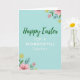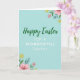 This card features a soft robin’s egg blue background that feels like an open spring sky, with a gentle, friendly tone throughout 🌷. Centered near the top, the words “Happy Easter” appear in a flowing, cursive-style font in emerald green. Just beneath, “FOR A WONDERFUL Teacher” is set in a simple sans-serif style in bright white, stacked neatly so the message reads clearly. Floral clusters in opposite corners act like a quiet frame, as if two friends placed matching bouquets there for each other 🐰. In the top-right corner, pink blossoms and sunny yellow flowers sit among green and teal leaves, with rounded petals and tidy outlines. A matching arrangement mirrors it in the bottom-left corner, creating balance and a soft sense of togetherness. The overall palette blends pale blue, pink, yellow, and layered greens so the center text stands out without feeling harsh. The flowers show pink and yellow blooms with teal-tinted foliage in the top-right and bottom-left corners against the blue field.