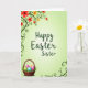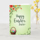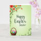 This card features a soft pale green gradient background that feels like early spring, with a tender, family-close tone carried through the gentle layout 🌷. Centered on the front is the message “Happy Easter Sister” in dark green flowing lettering, sized large and easy to read. Curving dark green vines frame the scene from the top-left and bottom-right, with small leaves and curling tendrils that lean toward the words as if embracing them. Bright red and warm orange flowers with deep, dark centers sit among the greenery, adding little sparks of color without crowding the message. In the bottom-left corner, a rustic woven basket rests in a patch of green grass, adding a cozy, homey touch 🐰. The basket is filled with decorated eggs in pink, yellow, blue, and green, some finished with delicate white floral patterns. The top-left vine arcs downward with a few leaves and blossoms, while the bottom-right vine curls upward toward the centered text.