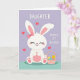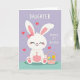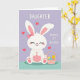 This card shows a white cartoon-style bunny sitting calmly with long ears tipped in pink, a small pink bow, rosy cheeks, and a gentle smile that feels like it’s meant for someone close 🐰. The bunny’s eyes are closed as if savoring a sweet moment, with a pink belly and matching paw pads adding to the soft look. Behind it, the background is lavender, fading into a light green ground that suggests a quiet spring meadow. Small red hearts float around the scene, hinting at affection the way a warm hug might linger between family or friends 🌷. To one side, a striped basket is filled with pastel eggs decorated with simple patterns, and a tiny yellow chick peeks out as if sharing a secret with the bunny. The word “DAUGHTER” sits at the top in uppercase lettering, and “HAPPY 1ST EASTER” appears to the right in matching uppercase text, both standing out clearly against the pale background. The eggs show soft shades like pink, blue, and yellow, and the basket stripes alternate in light tones beside the green foreground.