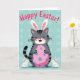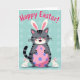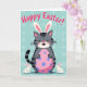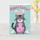 This card shows a grey tabby-patterned cat standing front and center, wearing white-and-pink bunny ears 🐰. The cat hugs a large pastel pink egg dotted with small blue circles, and its closed eyes and wide grin suggest a cozy, affectionate moment. On either side, two small cream-colored bunnies stand close by with gentle smiles, as if sharing the scene like old friends 🐇. The background is a calm aqua tone sprinkled with larger, pale blue polka dots that add soft texture without crowding the characters. Near the top, the words “Happy Easter!” sit above the figures in rounded bubble-style letters colored bright pink. The cat’s ears match the pink egg, while the cool blues in the dots balance the warm tones and keep the layout easy to take in. The two bunnies are positioned slightly lower than the cat, framing the egg and drawing your eye back to the center. Behind them, the aqua field fades evenly with light blue dots spaced across the whole backdrop.