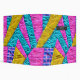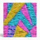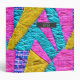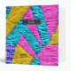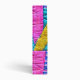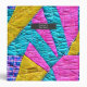Faux patchwork quilt inspired pink, yellow, and blue pattern on front and back with name inside gray rectangle at front.