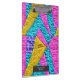 Faux patchwork quilt inspired pink, yellow, and blue pattern on front and back with name inside gray rectangle at front.