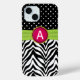 © Socialite Designs. Our girly and fun ribbon and jewel-look design, with zebra print and polka-dot pattern background, has a monogram to personalize this iPhone case. The ribbon is green and the jewel is pink with gold.