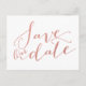 Printed Faux Rose Gold Foil Glamor | Wedding Save our Date Postcard. Elke Clarke © Other colors available at www.zazzle.com/monogramgallery. A simple, yet versatile, handwritten script rose gold save the date for weddings or other special occasions such as rehearsal dinners, couple's showers, wedding anniversary celebrations. Rose gold foil is a printed photo effect.