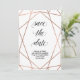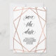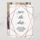 This elegant save the date card features a faux rose gold geometric pattern on a white background, with modern typography. The back contains your full bleed photo overlaid with the same geometric pattern.