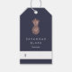 Chic hang tags for your boutique or retail business feature a faux rose gold foil pineapple on a rich midnight blue background, with two lines of custom text beneath in white. White space provided to write in your prices. Adjust the currency symbol as needed using the template. Backs are solid white for your additional custom text or handwritten message. Coordinates with our Pineapple office suite in four elegant colorways.