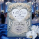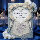 Celebrate your sophisticated industrial union with this blue-gray architectural design featuring a central heart frame and 3D-effect carved floral motifs.This design demonstrates high-level observational expertise in neoclassical masonry, featuring a central heart-shaped cutout framed by realistic faux-carved drapery and intricate white roses. The composition utilizes a sophisticated palette of monochromatic blue-gray and cream, set against a weathered brick-texture background to evoke a romantic loft atmosphere. The typography balances a clean, authoritative serif with an fluid, artistic handwritten script, ensuring a hierarchy that is both legible and aesthetically refined. Shadows and highlights are digitally rendered to provide a convincing 3D dimensional effect, ideal for modern classicists.