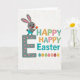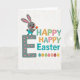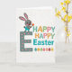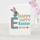 This card features a grey-furred bunny with pink-lined ears wearing blue overalls, standing in a lively pose atop a huge teal letter “E” dotted with small pink circles 🐰. The bunny grips a small tool with an orange tip, and its wide grin and forward-leaning stance suggest it’s proudly finishing something for a friend. To the right, the phrase “HAPPY HAPPY Easter” appears in large, chunky letters, with “HAPPY HAPPY” stacked above “Easter.” The letters are colored in a mix of orange, green, pink, and teal, creating a bright spring look without feeling busy. Under the words, seven decorated egg shapes line up in a neat row, each filled with patterns like stripes and polka dots 🌷. The eggs sit comfortably in the open space, as if laid out for two people to admire together. The background is white with tiny pastel speckles scattered across it like light confetti. The oversized teal “E” anchors the left side while the colorful text and patterned eggs balance the right side.