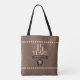 Aged leather-looking colored background with faux brass studs on this large tote bag with custom-year milestone anniversary text and your logo, the perfect addition to your work motivation, recognition and incentive programs.
