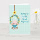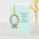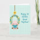 This design shows a small, humanlike bunny in blush pink sitting on a rustic brown swing, its long ears tilted slightly as if listening closely 🐰. The bunny’s rosy cheeks and relaxed posture suggest a sweet bond, like it’s waiting for a gentle push from someone nearby. It wears a simple teal tunic, and its tiny feet hang down in an easy, carefree way. The swing hangs inside a circular wreath made of twisting brown branches, filled with bright green leaves and small blossoms in yellow and soft sky blue 🌷. A single braided rope rises from the wreath and leads upward, placing the hanging decoration toward the upper-left area of the scene. On the right side, teal lettering reads “Happy 1st EASTER, Great Nephew!” in a flowing handwritten look, spaced neatly to balance the illustration. Behind everything is a pale aqua background with a faint grid texture that stays subtle while framing the wreath, rope, and swing.